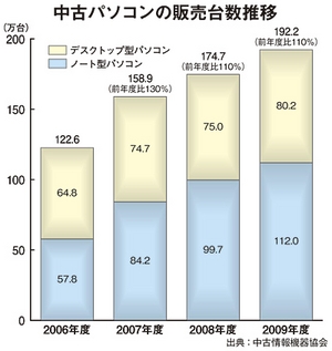 中古PC市場の成長は本物か 中古情報機器協会(RITEA)によると、2009年度の中古PCの販売台数は、前年度比110%増の192万2000台となった。調査を開始した2006年度以降、右肩上がりの成長を遂げてきており、国内で流通するPCの1割以上を占めるまでになっている。 家電量販店の店頭に中古PCが並ぶ光景は珍しいものではなくなった。SOHOや個人事業主のユーザーにとっては、新品と並ぶ有力な選択肢だ。一方で、中古PCの販売事業者にとっては、素直に喜べない事態が起きている。