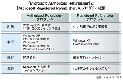 MARは、年間1万2000ライセンスの発注を必須条件としており、パートナーが購入する再生中古PC向けライセンスにWindows 7(Home Premium/Professional)とWindowsXP(同)、Windows Sever 2003を用意している。もう一つのMRRは、Windows XP(同)のみの提供となる。Windows Vista(Home Basic/Premium/Business)搭載PCでは、Windows 7の中古PC向けライセンスを購入することになる。