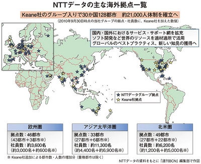 グローバルデリバリー確立へ まず、大きく動いたのがNTTデータだ。米国の準大手SIer、Keane(キーン)を2010年末までをめどにグループ化することを発表。キーンは09年12月期の年商約7億8800万ドル(約654億円)、1万2500人ほどの社員を抱える有力SIerで、NTTデータは同社のグループ化で北米におけるビジネスの大幅な拡大を目指す。キーン買収に先立つ今年7月には、同じく米国中堅SIerのIntelligroup(インテリグループ、年商規模約1億4100万ドル=約117億円)を傘下に収めるなど、積極的なM&Aを展開している。