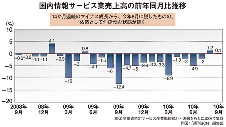 情報サービス産業協会(JISA)が集計している経済産業省・特定サービス産業動態統計によれば、国内情報サービス業の売り上げは、今年7月まで14か月連続のマイナス成長。8月以降、若干もち直しつつあるが、一進一退に変わりはなく、今後も大幅な売り上げ増は期待できないというのが大勢の見方だ。