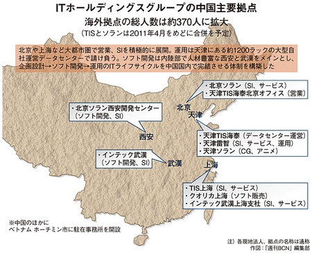 主要ターゲットの中国には、ITHDグループのTIS、ソラン、インテック、クオリカなど多数のグループ会社が進出。天津のTIS拠点は、中国最高の設備水準を誇る1200ラック規模の大型データセンター(DC)を運営。同国における自社DCは、現時点ではNTTデータですら保有しておらず、大きなアドバンテージとなっている。天津DCは、今年4月に全面開業して半年余り。悲願だった地場の金融大型案件で初受注のめどをつけている。金融機関を得意とするTISは、地場系金融案件については自社の強みを存分に生かせる分野だ。