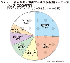 2010年にミック経済研究所が発表したメーカー別シェア(金額ベース)では日本IBMが25%台の高いシェアをもっている(図2)。2位のマカフィーとはシェアが拮抗しており、その差は3ポイント程度となっている。国内市場では日本IBM、マカフィーのほか、シスコシステムズ、ジュニパーネットワークスのシェアが高いが、後発メーカーのセキュアソフトはIPSを前面に打ち出した販売展開を行っており、国内市場開拓に力を入れている。