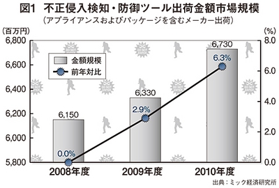 ミック経済研究所の調べによると、ここ数年の平均成長率は3~4%と、緩やかながらも堅調な伸びをみせている。しかし、このところウェブアプリケーションのぜい弱性を狙ったウイルス攻撃が問題となっており、IPSはその対策ソリューションとして注目を浴びている。2010年の市場成長率では前年度比6.3%の伸びを見込んでいる(図1)。