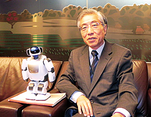 RTを組み込んだ人型ロボット「PALRO(パルロ)」と並ぶ富士ソフトの白石晴久社長。有名メーカーからの引き合い好調で、終始ご機嫌な様子だ。