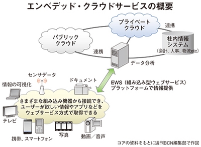 組み込みソフト有力SIerのコアも、大胆な戦略を打ち出す。組み込みソフト技術を生かした「EWS(エンベデッド・ウェブ・サービス)」基盤を、2010年10月に開発。組み込みソフトを入れた機器と業務システムやクラウド型サービスをシームレスに連携させるものだ。コアは、ユーザー企業が保有するパソコンやネットワーク機器、サーバー・ストレージなどから情報を集め、IT資産の管理を行うための構成管理データベース(DB)を開発しており、これと組み込み機器をEWS基盤で融合させる。