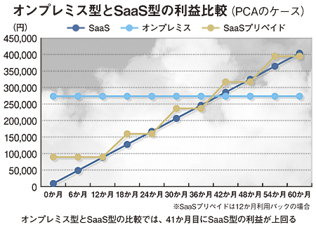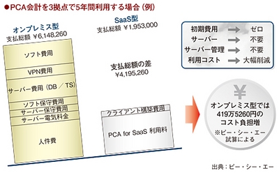 同社の試算によると、「PCA会計」を3拠点で5年間利用する場合、「PCA for SaaS」を利用するよりもサーバーコストやサーバー・ソフト保守コストなどがかさみ、総額419万5260円のコスト負担増になるという。