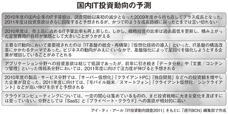 クラウドに商機はある 調査会社アイ・ティ・アールによれば、クラウドはまだ投資戦略に大きな変化を及ぼすには至っていないが、人事管理・給与計算システムや生産管理システムのSaaS利用、海外展開にあたっての会計システムの多基準対応などがクラウドビジネスの商機として期待できるだろう。