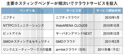 最近の例を挙げると、ニフティが2010年1月に「ニフティクラウド」をスタートしたのに続き、NTTPCコミュニケーションズが10年10月に「WebARENA CLOUD9(ウェブアリーナ クラウドナイン)」、ビットアイルが10年12月に「サーバオンデマンドNEXT」、GMOホスティング&セキュリティは2011年2月から「GMOクラウド」を開始。さらに、リンクとエーティーワークスは11年春をめどに「at+linkクラウド(仮称)」を立ち上げる方針を示すなど、クラウドサービスはまさに百花繚乱の様相だ。