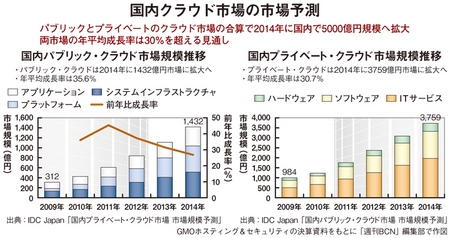 クラウドサービス百花繚乱 伸び悩む国内情報サービス市場にあって、数少ない有望市場となっているのがクラウドコンピューティングを活用したビジネスである。有力ホスティングベンダーのGMOホスティング&セキュリティでは、調査会社IDC Japanの調査をベースに、国内クラウド関連市場は2014年まで年率30%余りの勢いで増えるとみている。他のホスティングベンダーもクラウドを有望視しており、DC設備の増強やクラウド基盤の開発に総力を挙げて取り組んでいる。
