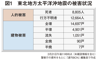 東日本を広く襲ったこの巨大地震が残した爪跡は深い。3月21日23時時点で、死者は8805人で行方不明者は1万2664人(警察庁調べ)。死者の数は阪神淡路大震災を上回った。ほぼ3日前の18日15時時点では、死者は6548人、行方不明者は1万354人。日を追うごとに命を落とす人が増えている。警察庁によれば未確認の範囲があるということで、今後増える可能性がきわめて大きい。