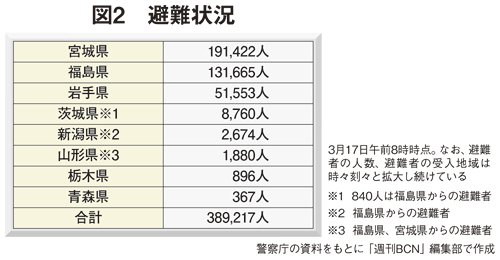 建物の状況もひどく、今回の地震で1万4697戸の建物が全壊し、4901戸が半壊した。この影響で今、38万9217人もの人が避難生活(警察庁、3月21日23時時点)を余儀なくされている。とくに宮城県、福島県、岩手県は深刻な被害を受けた。