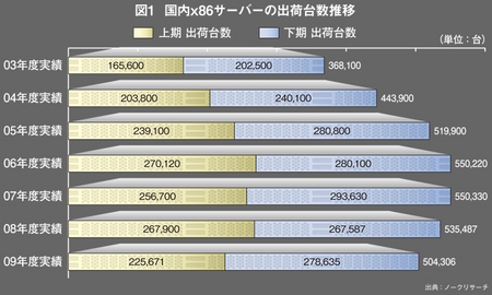 x86サーバーの過去10年の推移をみると、情報システムのオープン化で需要が強まり、07年度まで一貫してプラス成長を果たしてきた。07年度には55万330台という過去最高の出荷台数を記録している。しかし、08年、09年度は2年連続で前年度の実績を下回っている。リーマン・ショックの影響で、ユーザー企業はIT投資を抑制するために情報システムの新規開発を止め、既存システムを延命したことが響いた。そして、10年度、止まっていたユーザー企業のIT投資が復活し、プラス成長に転じた。これがx86サーバー市場の軌跡である(図1参照)。