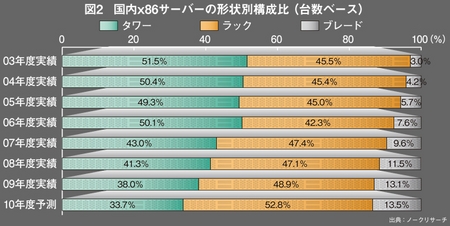 図2には、全x86サーバーの出荷台数における形状別の構成比率を示した。タワー型が減少し、ラック型が伸びている。2010年度の出荷見込みでは50%を超える見込みだ。その一方で、見逃せない存在がブレードである。ブレードは03年度では全体の3.0%にも満たなかったが、09年度にはその4倍強の13.1%に増加し、10年度は13.5%に到達する見込みだ。ジワジワではあるものの、その存在感を示し始めている(図2参照)。
