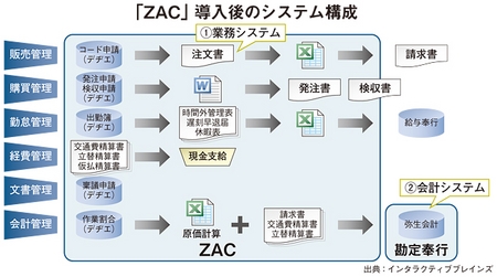 当初インタラクティブブレインズは、NTTデータグループのエックスネットやオービック、ミロク情報サービスなどのパッケージを検討していたが、ダイレクトメールを通じて知った「ZAC」に魅力を感じたという。販売管理や購買管理、勤怠管理、経費管理、文書管理などの「ZAC」一式に、会計システムの「勘定奉行 VERP」へのリプレースを加えて、計800万円程度で導入できる“お得感”が他社に比べ大きかった。短期間で導入できる点も選定理由となった。