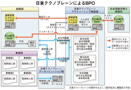 「PCA給与」と「たんぽぽ」の導入で、NTBはデータ入力から給与明細書の配送にまで請負業務を拡大した。業務フローは、(1)データソリューション部が「たんぽぽ」にデータを取り込み、(2)「PCA給与」に連携。給与明細書を出力、(3)ユーザー企業の本部・店舗に配送する──という流れとなっている。