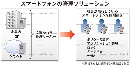 いま市場には、Androidを含め、社員のスマートフォン端末を一括管理しセキュリティポリシーを適用するモバイルデバイス管理ソリューションが続々と登場している。KDDIは、OSレベルでの管理を提供する一方、セキュリティメーカーなどが提供するソリューションはアプリケーションのかたちで提供している。