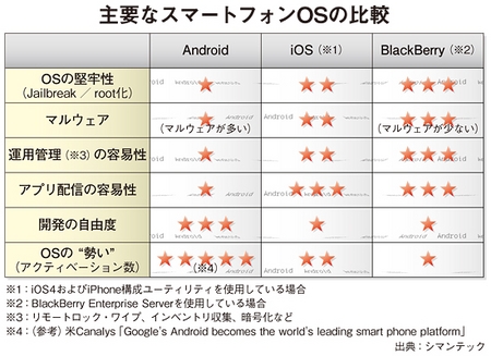 スマートフォン市場におけるOS別出荷台数シェアで、AndroidがiOSを逆転したとの調査報告があった。デバイスの完成度が高くなり、昨年から本格的に立ち上がってきたAndroid OSを搭載した端末は、国内市場で急速に普及する勢いをみせている。企業の関心も高く、通信会社にはAndroid関連の問い合わせが増えているという。一方で、懸念材料として挙がっているのが、オープンなプラットフォームであるがゆえのセキュリティへの懸念だ。今後、確実に法人市場で伸びるAndroid端末のセキュリティ管理ソリューションが市場に続々と登場している。Android端末の法人普及の動きと、セキュリティ管理ソリューションの販売戦略を探った。