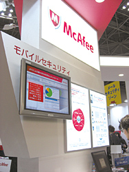 マカフィーは、モバイルセキュリティソリューション、仮想化、SaaSなどを中心に紹介した。モバイルコーナーでは、3月に提供開始したばかりの、「McAfee Enterprise Mobility Management」を展示。