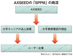 AXSEEDは、大手携帯電話代理店と組んで販売するとともに、イーモバイルなど、大手キャリアの法人営業部隊から販売を進めている。