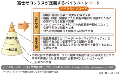 富士ゼロックスが「バイタル・レコード・マネジメント」を自社に展開する際には、地震など純粋リスクへの対応とビジネスリスクを軽減する部分で「説明責任」を担保するために、重要文書を特定するところから始めた。分別した文書は、総務部や法務部、営業部など別に「活性化文書(月に1回以上閲覧する文書)を電子化し、それ以外(不活性文書)を東京本社など免震構造を施した「レコードマネジメントセンター」に保管する。内田グループ長は「バイタル・レコード(重要文書)は、企業がもつ全文書量の2~7%しかない。文書に定義づけて保存すれば、事業継続計画と関連した電子化ができる。継続できる管理システムをつくることが重要」という。