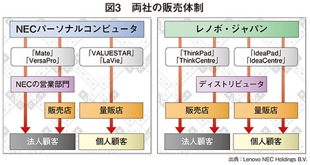 販売面での連携は、現時点ではほとんどないといっていい。図3には新会社が設立された後の販売体制を示した。レノボ・ジャパンとNECパーソナルコンピュータで、完全に分断されている。高須氏は、「従来通りの販売体制を維持する」と明言しており、それぞれの事業会社が別々に販売することになる。あるNEC系SIerの社長は、「変わったことは何もない。(今回の協業は)現時点でメリットもデメリットもない」と話している。