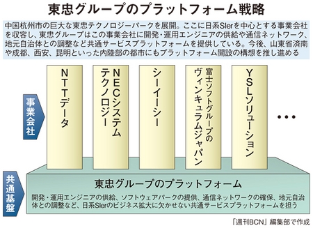 東忠グループは、上海から新幹線で1時間弱の杭州市内にある広大な敷地のハイテクパークに、開発や運用を担う東忠テクノロジーパークを開設。すぐ近くにはソフトバンクグループと提携関係にあるオンライン取引サービス運営大手のアリババグループの拠点がある。周囲の開発区には、近代的なオフィスビルに大小さまざまなソフト開発やネットサービス会社が軒を連ね、首にIDカードをぶらさげた若い技術者たちが闊歩する。東忠グループは、ここにNTTデータや富士ソフトグループのヴィンキュラムジャパン、シーイーシー、NECシステムテクノロジーなど日本の有力SIerを招き入れ、中国地場に向けたビジネス展開を全面的に支援している。