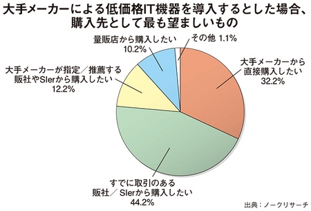 また、大手メーカーの低価格IT機器を導入するとした場合に購入先として最も望ましいものについては、「大手メーカーから直接購入したい」(32.2%)、または「すでに取引のある販社/SIerから購入したい」(44.2%)と回答した企業が過半数を占める。直接販売を望む企業は多いものの、既存の販社/SIerに依存するSMBの割合が高く、半分近くを占めていることがわかる。大手のIT機器メーカーは、SMBとパイプを太くしている既存のSIerを販売チャネルとして獲得することが、低価格機器の販売拡大につながる近道になりそうだ。