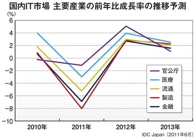 国内のIT産業全体の行く末は、厳しい見方が大勢を占める。国内でIT投資の比率が大きい「金融」「流通」「製造」「医療」「官公庁」のIT投資額の10年~13年の予測をみると、多少の浮き沈みはあるが、前年と比較した金額はだいたい2~3%増。ほぼ変わらないといっていい。また、調査会社のガートナージャパンが予測したデータによると、国内ITサービス市場の2010~15年のCAGRは0.3%でほぼ横ばいだ。
