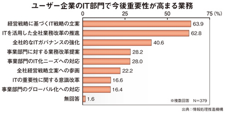これに加えて、比率は小さいものの、2年前に比べて2倍以上ポイントが伸びているのが、グローバル化への対応だ。経営戦略に沿ったIT戦略の立案などの高度な力を、ユーザー企業の経営幹部は、ITの技術者集団である情報システム部門に求め始めているのだ。それは、ITベンダーに各製品・サービスやソリューションの魅力を伝えるだけでなく、ユーザー企業の事業発展に沿った提案を用意しろ、と要求しているともいえる。