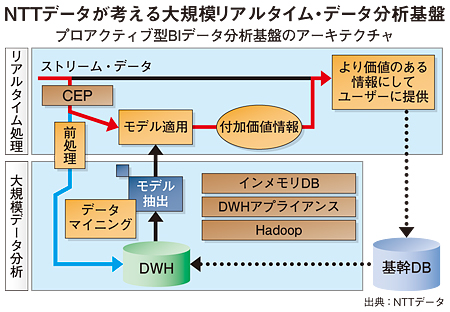 すなわち、(1)蓄積したデータをさまざまな角度から集計・分析して見える化することで、計画業務、経営管理、需給調整などに役立てる「集計分類型」、(2)蓄積した膨大なデータから、隠れた関係性や規則性を発見する「発見型」、(3)業務方式の変更に伴う効果を事前に試算して新しい業務方式をデザインすることでSCMの最適化などにつなげる「WHAT-IF型」、(4)ユーザーの行動を理解し、一歩先回りして、気の利いたサービスや機能を提供する「プロアクティブ型」の区分である。このうち、NTTデータでは、大規模リアルタイム・データ分析に基づく「プロアクティブ型BIサービス」への対応をブラッシュアップしている。そこで考えているのが、センサーなどから上がってきたデータを、リアルタイムに、超高速に「CEP」で処理し、分析ロジックを適用して付加価値のある情報に変換し、それをユーザーに提供するとともに、同時に蓄積される大規模データを再分析して分析ロジックを更新する──というものだ。