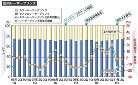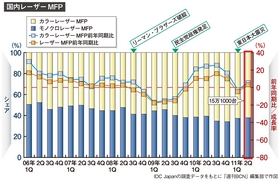 調査会社の推計値をみると、コピー・プリンタ機器メーカーの見通しはさらに深刻さを増す。IDC Japanによると、リーマン・ショック以降、環境配慮やコスト削減のニーズが高まった2010年1~3月の四半期からの1年間を除き、販売動向はマイナスのベクトルを描いている。マルチファンクションプリンタ(MFP=デジタル複合機)、シングルファンクションとも、メーカーが機器販売の成長戦略を立てるには強い材料が見当たらない。
