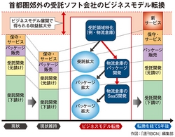 コンサルティング会社の船井総合研究所では、テクノ・マインドのように受託ソフト開発会社の事業モデルを転換させるためのコンサルを推進している。受託ソフト開発市場の見通しについて、斉藤芳宜・チームリーダーチーフコンサルタントは「ライフサイクルの山を越え、淘汰のフェーズに突入している」との観点で変革を促す。 前述した通り、ビジネスの旨味にとらわれている受託ソフト開発会社は、時代の変化に気づきにくい。だが、変化を察知し、救いを求めて船井総研に駆け込み、ビジネスモデルの転換に成功しつつある例は少なくない。同社は、成功への道筋として「メーカーになることと、販売力を強めること」(斉藤チーフコンサルタント)を提唱する。中期スパンで受託ソフト開発会社からの脱皮を図るため、請け負う受託開発案件は、業種・業態に特化し、得意分野を磨く。これを「戦略的な下請け」と呼ぶ。そのなかから、汎用的に販売できるパッケージ製品をつくる。受託案件が一時的に減るので、その間を埋めるため営業力を磨き、パッケージを売って当面を凌ぐ。