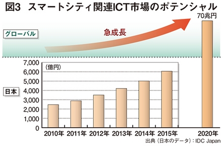 さらに、グローバルで2015年以降のスマートシティ関連市場をみれば、こちらも著しい成長が見込まれている。NECスマートシティ事業推進部の正力部長は、「2020年までに、道路や建物の建設などを含めたスマートシティ市場は全世界で700兆円に拡大する。そのなかで、およそ10%、70兆円をICTソリューションが占める」と予測している(図3を参照)。ICTベンダーが市場の可能性に大きな期待を寄せて、スマートシティをいち早く事業化することに強い意欲を示すのは当然である。