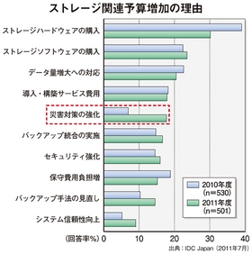 IDC Japanが従業員数1000人未満のSMBに行った調査では、東日本大震災の影響でストレージを購入する機運が高まっていることがわかった。ストレージを購入する理由としては、災害対策を挙げる企業が増え、データ量の増大に対応するためだけでなく、SMBでもBCP(事業継続計画)やDR(災害対策)の観点から、ストレージの購入を推進する傾向が出ている。