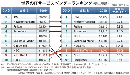 もう一つの潮流であるグローバルでは、国内の人口減少局面において、ユーザー企業が主にアジアの成長国に活路を見出していることが背景にある。情報サービス業トップのNTTデータは、アジア圏だけでなく、欧米でもM&A(企業の合併と買収)を積極的に展開。2010年は世界のITサービスベンダーランキングで、NECを追い抜いて8位にまで上り詰めた。国内市場だけで成長を持続させることは困難と判断し、早い段階でM&Aに将来の可能性を見出した。しかし、すべてのSIerがNTTデータのような巨額な投資を行えるわけではない。それぞれの体力に応じて海外進出先を選んだり、地場有力SIerとの提携や合弁で顧客のニーズを満たしていく必要がある。