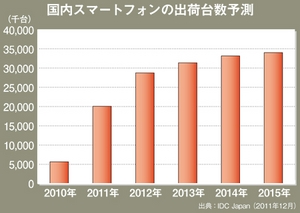スマートデバイスが急伸 IDC Japanが11年12月に発表したデータによると、11年第3四半期(7~9月)の国内スマートフォン出荷台数は、前年同期比243%増の530万台、メディアタブレット(タブレット端末)の出荷台数は133%増の42万台となり、ともに大幅に成長した。スマートフォンに関しては、12年通年では2830万台、15年通年では3403万台に拡大すると予測した。IDC Japanの木村融人・PC,携帯端末&クライアントソリューションシニアマーケットアナリストは、タブレット端末について「通信事業者の手厚い販売奨励金による需要喚起が期待でき、2012年もプラス成長を続ける」と分析。個人市場、法人市場を問わず成長を疑っていない。
