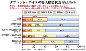 タブレット導入、4割超の企業が検討 日本情報システム・ユーザー協会(JUAS)の調査によると、iPadやAndroid版のタブレット端末を「導入済み」「試験導入中」「検討中」とした企業は44%に達している。売上高1兆円以上の大企業に限れば74%を占め、この先ますますタブレット端末の導入が増えるのは確実だ。