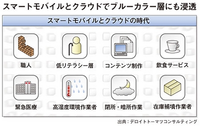 MRの利用もしかり、パソコンを持ち込めない場所でスマートデバイスを使うことができ、IT利活用を促進する起爆剤になる可能性がある。スマートデバイスの企業利用に詳しいデロイトトーマツコンサルティングの八子知礼テクノロジー・メディア・テレコミュニケーションズパートナーは、「ITに馴染みが薄いブルーカラー層や低ITリテラシーの業務領域にスマートデバイスが普及し、国内企業の労働生産性を引き上げる要因になる」と話す。例えば、建築現場で現場監督は、職人の勤怠管理や日々の原価管理などを行う。普通は会社に戻ってからパソコンで記入・報告するが、これを業務の合間にスマートデバイスを使ってこなすことが可能になる。