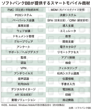 ソフトバンクBBが付加できるスマートデバイス向けのサードパーティー製品・サービスは、iOS、Android、Windowsの全OSで製品を揃え、MDMをはじめPOSシステムやSFA(営業支援)/CRM(顧客管理)、ウェブ会議、フィルタリングなど40カテゴリ以上で100製品以上に達する。同社の北澤英之・モバイルビジネスマーケティング部長は、「法人でのスマートデバイスの使い方がみえてきた。製品・サービスは、さらに拡大する傾向にある」と、ソフトメーカーを中心にスマートデバイス向け商材の開発が、この先も加速するとみている。