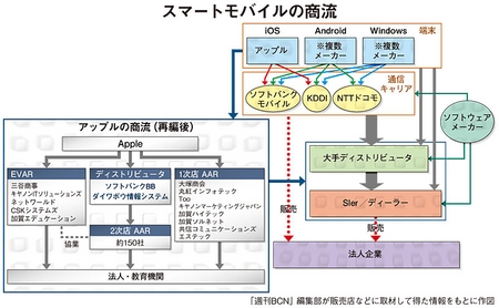 ソフトバンクBBは、社内の多くの社員に、パソコンとiPhone/iPadを配布している。これらの端末を、デスクトップ環境をネットワークを通じて提供する「Desktop as a Service(DaaS)」の仮想環境で結び、シンクライアントの形式で利用している。高瀬本部長は「当社で試験的に導入しているが、これを外部にも提供する」と、スマートデバイスにも関連した企業の基幹インフラ構築に必要な仮想化環境の構築支援を行っている。昨年11月には、販売代理店向けにこうしたソリューション販売を支援する約30人の専任部隊を設置した。同社の販売代理店のうちスマートデバイスの販売をする「モバイルパートナー契約」を結んでいるITベンダーは約500社に達し、今も増え続けている。
