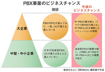 さらにいえば、法人向けスマートフォンの普及やユニファイドコミュニケーション(UC)の需要拡大が後押ししている。PBXの箱売りにとどまらず、携帯端末の内線化やビデオ会議といった周辺サービスを組み合わせたシステムを提供することが、有望なビジネスとなる可能性が大きくなってきているのだ。