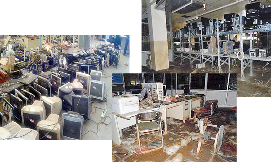 被害を受けた富士通のユーザー企業の事務所と冠水したIT機器