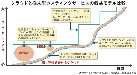 もう一つ見逃せないのが、クラウドビジネスの収益モデルの手堅さである。クラウドシステムは提供するリソースに応じて、薄く広く利益を乗せることが可能であり、従来型の受託ソフト開発やパッケージメニュー単位で売れるホスティングサービスのように、まとまった収益は期待しにくい。しかし、GMOクラウドの青山満社長は「クラウドサービスそのもので赤字になることはまずない」と言い切る。クラウドインテグレーションを手がけるサイオスの栗原執行役員も、「薄利ではあっても、クラウドビジネスは必ず利益が出るモデル」と、手応えを感じている。