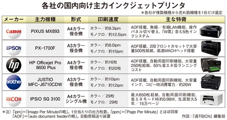 ビジネスインクジェットをラインアップするメーカーのなかで、製品群の拡充と販売促進に最も力が入っているエプソン販売も、ページプリンタと比較して「半分以下のコスト」を売り文句に販売を展開している。同社は8~9月頃に、現行14機種に加えて新機種を投入する計画だ。ブラザー販売も「ビジネスインクジェット市場は確実に伸びている。給紙の大容量化など、ビジネス用途に必要なスペックをさらに充実させた機種を揃える」(大澤部長)と、年内に製品群を拡充する予定だ。