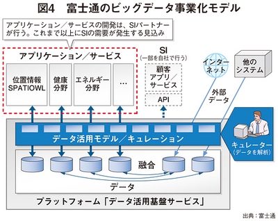 ビッグデータの事業化を加速する大手ベンダーのなかでも、富士通の動きは特徴的だ。富士通も他のベンダーと同様、ビッグデータの各レイヤーで商材を用意し、統合的なソリューションを提案するが、それにとどまらない。同社がビッグデータの事業化をきっかけに目指しているのは、「データを扱う流通事業者になる」(コンバージェンスサービスビジネスグループ戦略企画統括部の小林午郎統括部長)というのだ。