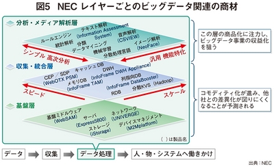 エキスパート育成に投資 NECは、インフラやキャリア、サービスなど、各事業部から約50人の要員を集め、横断的にビッグデータの事業化に取り組んでいる。同社は「収集」と「分析」のレイヤーの製品はコモディティ化が進み、他社との差異化が図りにくいとみて、「サービスを中心とする『活用』レイヤーの商材化に積極的に取り組んでいく」(佐藤博 執行役員兼企画部長)という。「活用」レイヤーの商材は、企業ごとにカスタマイズすることが必要で、パッケージ化した展開が難しい。なおさらエキスパート人材が欠かせないわけだ。