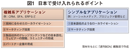 米国の場合、オンラインセールスやテレセールス、企業による独力でのサービス導入が主流だ。日本市場に参入して、商慣習・文化にどこまで対応するのかを、業務アプリベンダーは留意すべきだ。