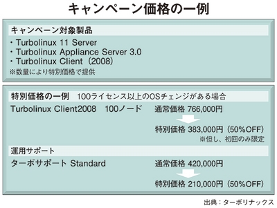 他社からの乗り換えを促進 ターボリナックスは、サーバーや基幹システム、アプライアンス機器などで長期間稼働中のLinux OSを対象に、今年3月30日から9月28日まで「OS乗り換えキャンペーン」を実施して攻勢をかけている。価格や運用サポート料金はライセンス数などによって異なるが、100ライセンス以上のOSを乗り換える場合に半額で提供するなど、かなりアグレッシブな動きをみせている。また、ターボリナックスの製品にリプレースする際の移行作業やカスタマイズについて同社のエンジニアが担当し、販社支援にもつなげている。