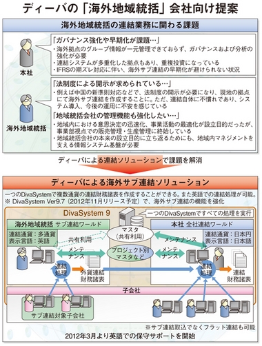 ●マネジメントのグローバル化 メールや情報共有などのフロント系システムに限らず、経理財務などバックオフィス系システムを「グローバル化」する流れが顕著なのも、海外進出企業向け製品・サービスが注目度を増している理由だ。前出のディーバは、7月3日、「『マネジメントのグローバル化』時代における経理財務部門の役割」と題し、東京でセミナーを開催した。同社が提案する地域統括会社向けのソリューションは、単一の「Diva System」で複数通貨の連結財務諸表を作成することができ、英語での連結処理が可能だ。