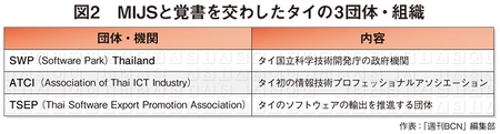 国産のソフトウェアベンダーが集まるメイド・イン・ジャパン・ソフトウェア・コンソーシアム(MIJS)は、この5月、タイの市場開拓に向けて動き出した。MIJSは、バンコク郊外のソフトウェアパークで開催された「日タイソフトウェアパーク交流会」に参加し、交流会の場で、タイのソフト産業の3団体・機関とパートナーシップを結ぶ覚書を交わした。3団体・機関は、タイ国立科学技術開発庁に属する「SWP(Software Park)Thailand」をはじめ、タイのIT市場に深く根づいた存在だ。各団体・機関の特徴を図2にまとめた。